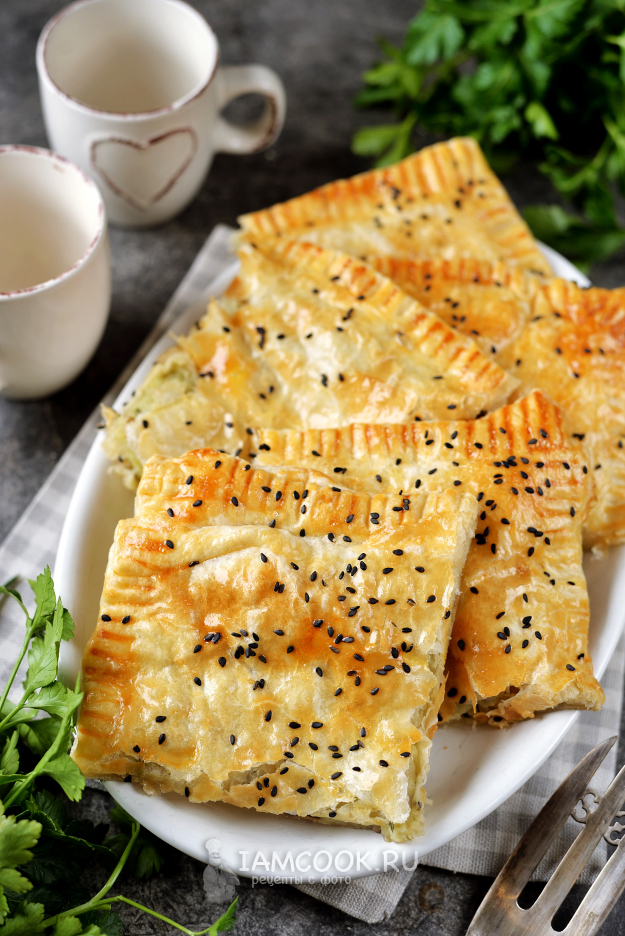 Готовый пирог нарежьте острым ножом с длинным лезвием на порционные куски и подавайте в качестве сытного перекуса.