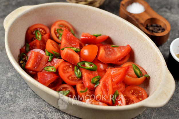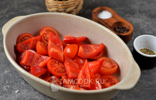 Помидоры и перец болгарский нарежьте крупными кусками, полейте форму для запекания оливковым маслом, выложите овощи в форму.