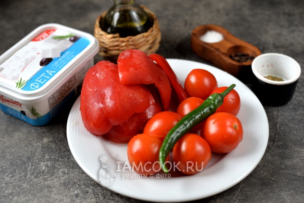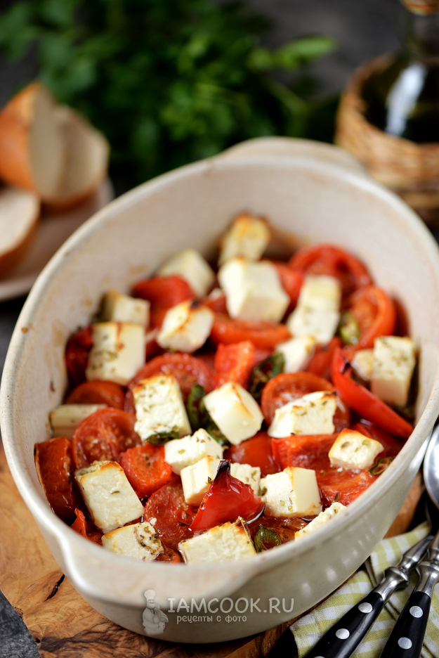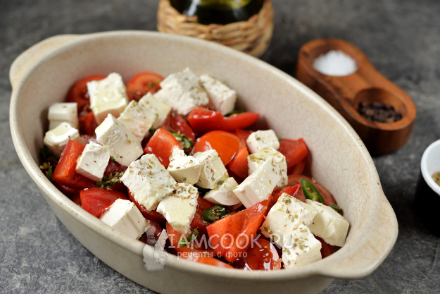 Фету нарежьте или поломайте небольшими кусочками, выложите на овощи, посыпьте все свежим или сушеным орегано, полейте оливковым маслом, отправьте в предварительно разогретую до 190 градусов духовку на 25-30 минут. Как только фета зарумянится - блюдо готово. Обычно фета достаточно соленая, соль может не понадобиться, но ориентируйтесь на свой вкус.