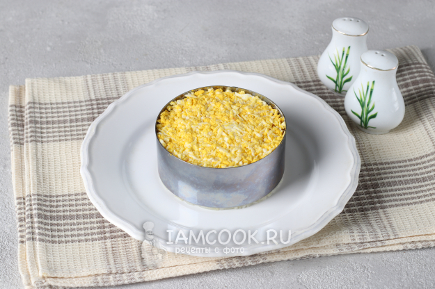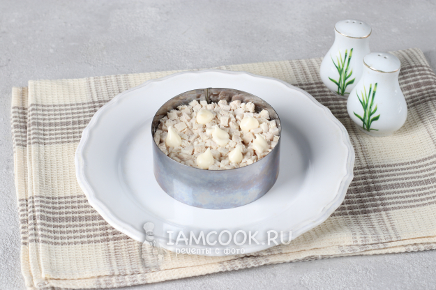 На плоскую тарелку поставить формочку, выложить натёртый на тёрке картофель, посолить и смазать майонезом.