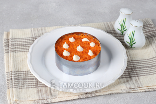 Далее выложить натёртую на тёрке морковь, также немного посолить и смазать майонезом.