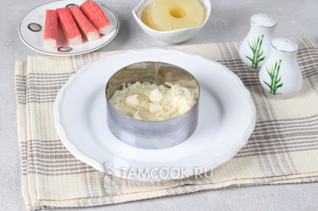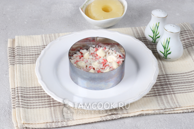 Консервированный ананас нарезать кубиками и выложить сверху крабовых палочек, смазать майонезом.