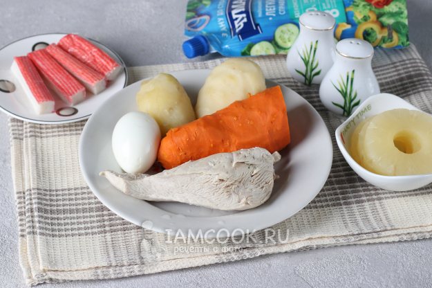 Подготовить ингредиенты для салата «Неженка» с курицей и крабовыми палочками. Куриное филе сварить в течение 30 минут в подсоленной воде, добавив при варке перец горошком и лавровый лист. Отдельно сварить в течение 15-20 минут картофель и морковь, остудить и почистить. Сварить яйцо в течение 10 минут, остудить в холодной воде, очистить от скорлупы.