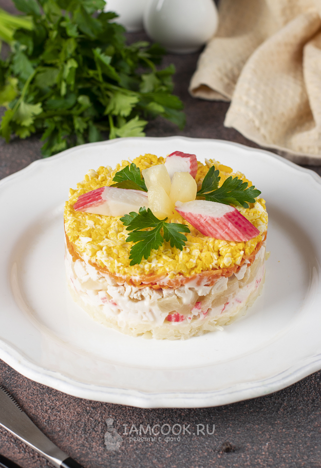 Нарезать мелко крабовые палочки и выложить сверху картофеля, смазать майонезом. Слои немного прижимать, чтобы при снятии формочки салат не развалился.