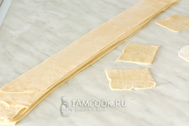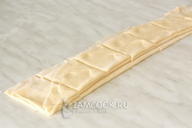 Каждую полученную ленту теста растяните на столе и сложите друг на друга. Нарежьте поперек на квадратики по 5 см.