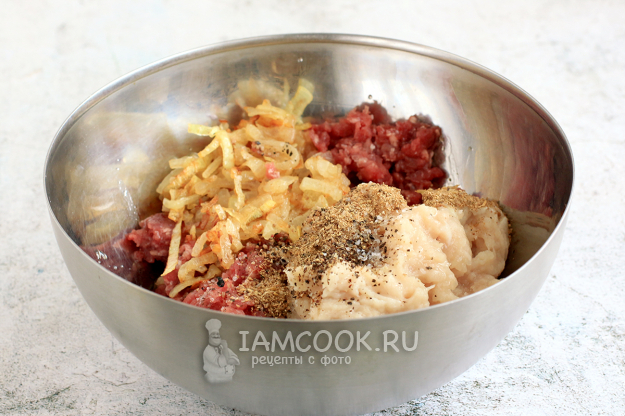 Соедините говяжий и куриный фарш, обжаренный лук вместе с маслом со сковороды, в котором он обжаривался. Добавьте соль, перец, кориандр и хорошенько вымесите. Если фарш получается плотным, то влейте пару ложек кипяченой воды.