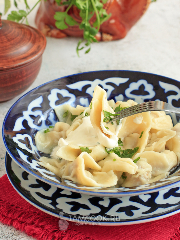 Обычно в Узбекистане пельмени варят на мясном бульоне, с овощами или зажаркой, готовят с ними суп, а еще подают с простоквашей или сузьмой. Но можно готовить так, как вам нравится, тем более что это не узбекский рецепт.