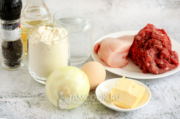 Возьмите необходимые продукты и начнем готовить пельмени с жареным луком в начинке.