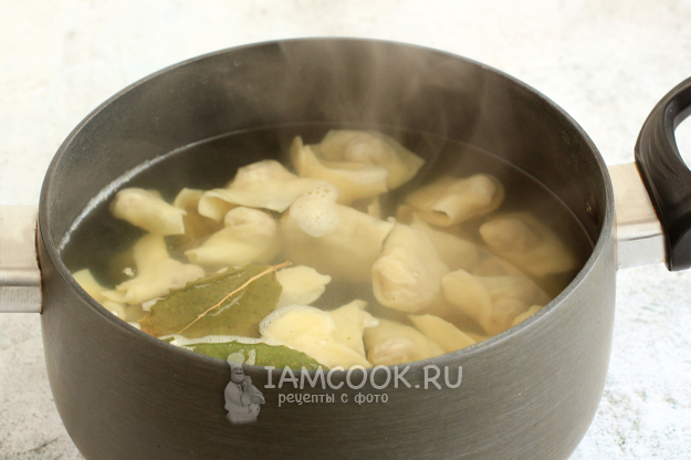 Для варки пельменей с жареным луком в кастрюлю налейте воду, посолите, добавьте пару лавровых листиков и рубленый чеснок. Можно посыпать любыми специями. Опустите в кипяток пельмени, доведите до кипения и после всплытия варите 5-7 минут.