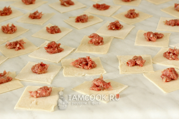 Разлепите стопки теста на отдельные квадраты, выложив на каждый половину чайной ложки фарша.