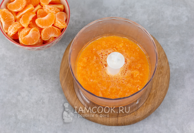 Поместите дольки мандаринов в чашу блендера (можно порциями) и взбейте несколько секунд в режиме пульсации. Так мякоть отдаст сок, но оболочки долек и семечки, если попадутся, останутся практически целыми.