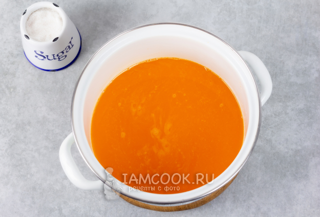 Процедите мандариновый сок и перелейте в кастрюлю. Добавьте по вкусу сахар. На среднем огне доведите смесь до кипения и варите 1-2 минуты, помешивая, чтобы сахар растворился.
