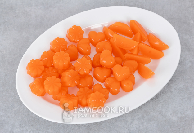 Охлажденный мармелад извлеките из формы. При необходимости нарежьте мармелад порционными кусочками. По желанию конфеты/кусочки мармелада также можно дополнительно обвалять в сахаре.