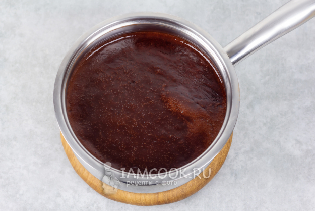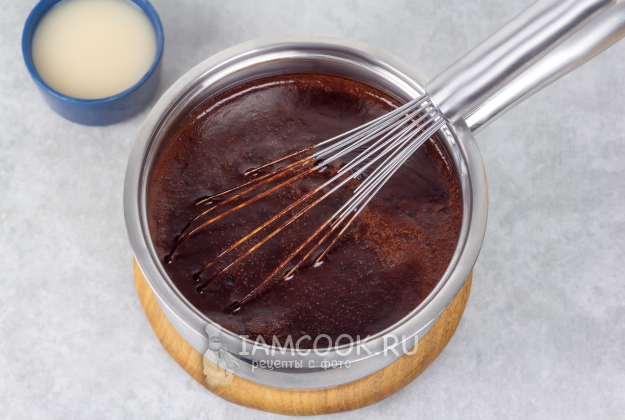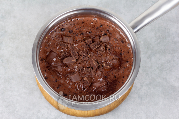 Когда смесь закипит, уменьшите огонь до небольшого. Разломайте на кусочки шоколад и добавьте в сотейник к остальным компонентам.