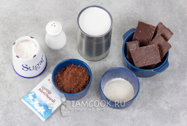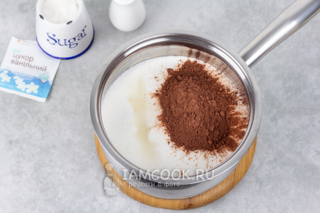В сотейник или небольшую кастрюлю с толстым дном отмерьте молоко. Добавьте сахар, какао-порошок, ванильный сахар и небольшую щепотку соли.