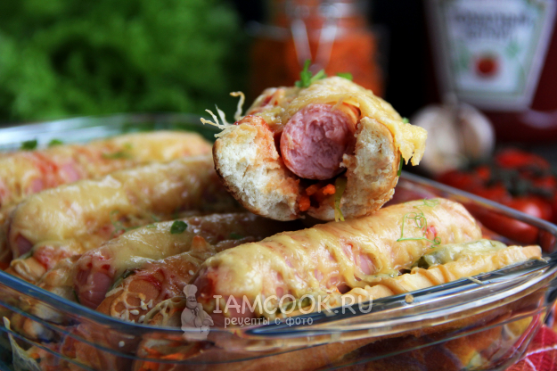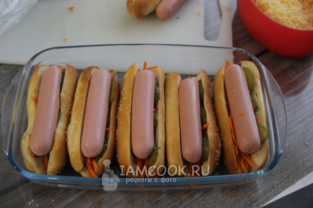 Пышной шапкой выложить тертый сыр. Поставить форму с хот-догами в разогретую духовку и запекать при 180 градусах 10 минут.