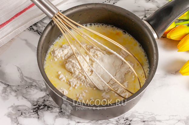 Всыпьте просеянную пшеничную муку и еще раз все взбейте. Старайтесь, чтобы не образовались комочки в массе. Поместите емкость на плиту, включите средний нагрев. Заварите крем в течение 7-10 минут, время от времени перемешивайте его.