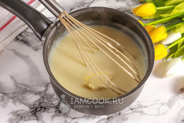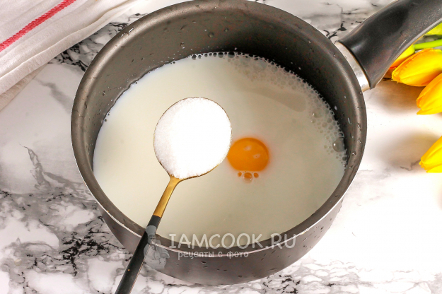 Пока будет выпекаться тесто, влейте молоко любой жирности и любого сорта в ковш или казан и добавьте туда же сахар, соль, желток куриного яйца. Взбейте все венчиком.