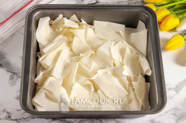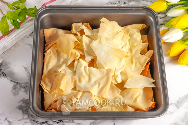 Тесто фило или слоеное тесто выложите в форму и испеките примерно 15-20 минут при 180 градусах в духовке, до румяности.