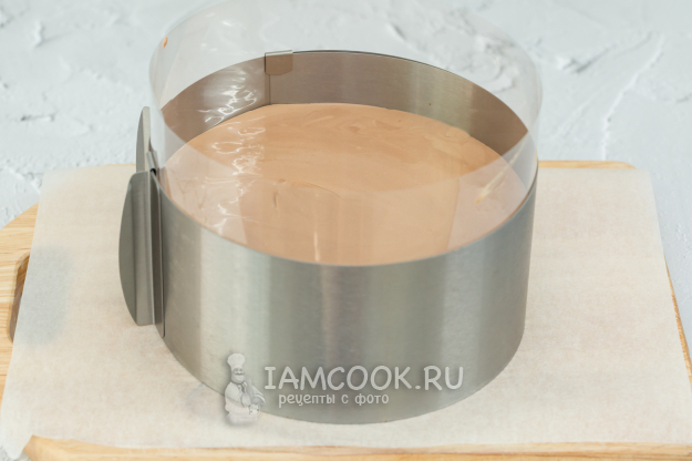 Если будете собирать торт как я, в кольце, то перед тем как начать сборку, поставьте кольцо на ровную твёрдую поверхность (доска, тарелка).