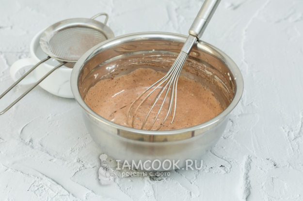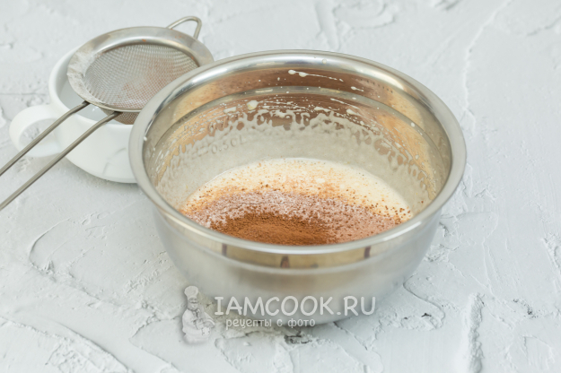 Муку смешайте с какао и разрыхлителем. Добавьте в яичную смесь половину мучной.