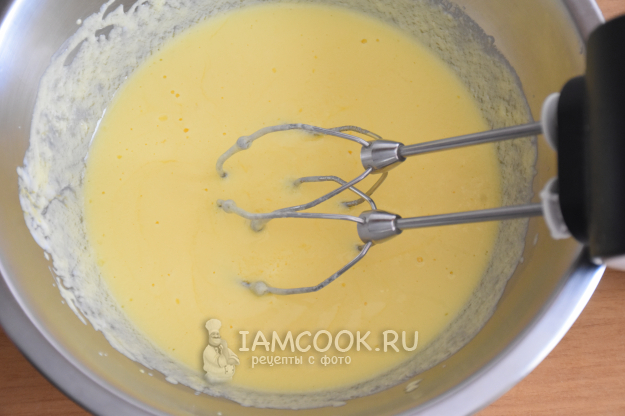 В отдельной миске соединить йогурт, ваниль, яйца и взбить венчиком или миксером на низких оборотах.