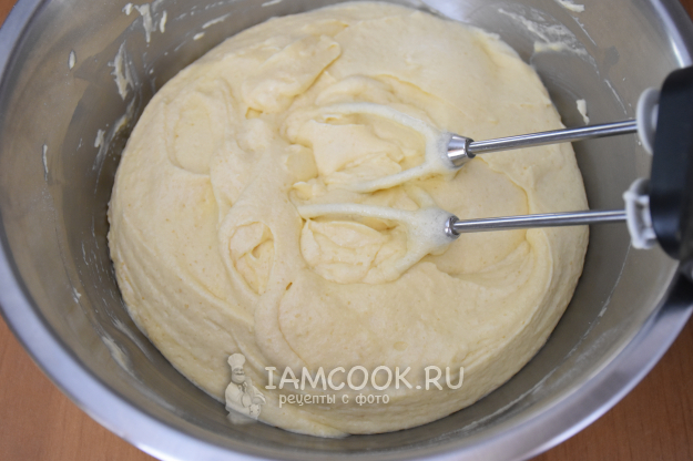 Добавить массу в мучную смесь и перемешать до получения однородного гладкого теста лопаткой или миксером на низких оборотах. Миску накрыть пищевой пленкой и оставить на 15 минут.