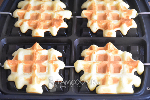 Разогреть электровафельницу и при необходимости смазать рабочую поверхность маслом. Выложить тесто столовой ложкой в вафельницу и выпекать согласно инструкции до готовности. Я выпекаю каждую партию вафель 6 минут.