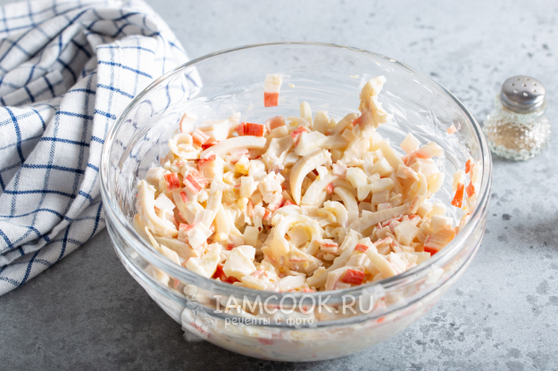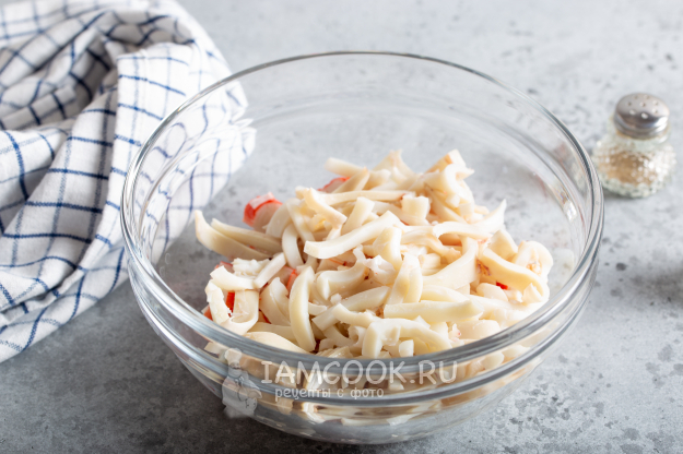 Отваренных остывших кальмаров порежьте соломкой и добавьте в салатник.