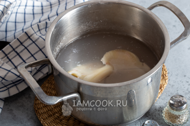 Размороженных кальмаров очистите от шкурки и внутренностей под струёй горячей воды. Опустите кальмаров в кипящую чуть подсоленную воду на 2-3 минуты. Затем достаньте их и остудите.