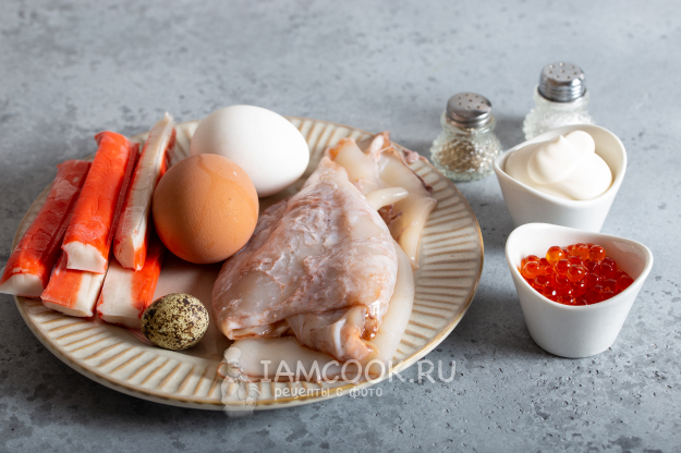 Подготовьте указанные ингредиенты для салата «Жемчужина» с кальмарами и красной икрой. Куриные и перепелиное яйца предварительно отварите и охладите. Куриные яйца - не дольше 10 минут, перепелиное яйцо - не дольше 5 минут. Кальмаров и крабовые палочки предварительно разморозьте. Подготовьте глубокую посуду для салата.
