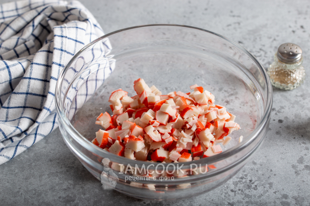 Крабовые палочки извлеките из плёнки и нарежьте мелким кубиком. Выложите в салатник.