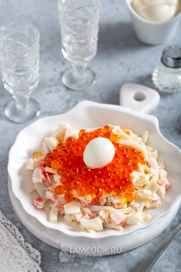 Добавьте в салат майонез, щепотку соли и перемешайте. Много соли не добавляйте, добавленная следующим шагом икра будет солёной.