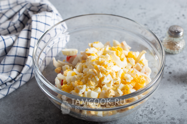 Отваренные и охлаждённые куриные яйца очистите от скорлупы и порежьте кубиком. Добавьте в салат.