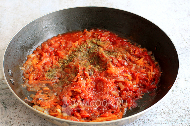 Затем добавьте к овощам разведенную томатную пасту, сахар, лимонную кислоту (1/4 ч.л. или меньше) или уксус, специи. Обжарьте еще 5 минут.