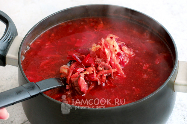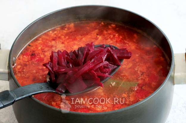 И в самом конце отправьте в борщ нарезанную соломкой свеклу. Дайте борщу покипеть минут 5, чтобы свекла успела отдать свою сладость и цвет. Попробуйте борщ на вкус и добавьте, чего по вашему мнению там не хватает - соли, кислоты, сладости или остроты.