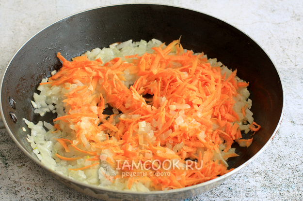 Рядом поставьте сковороду с растительным маслом и обжарьте в ней сначала лук, затем добавьте натертую морковь. Обжаривайте, помешивая, минут 10.