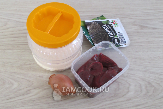 Подготовьте ингредиенты для печеночных оладий из печени кролика.