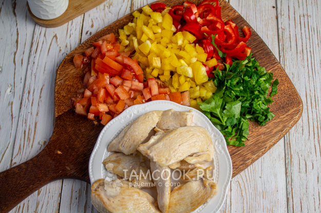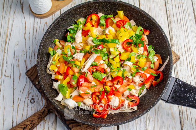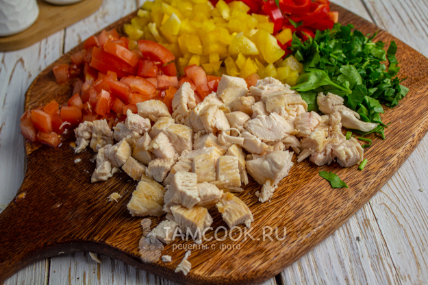 Куриное филе нарежьте на плоские небольшие кусочки и обжарьте на сковороде на 1 столовой ложке масла. Полуготовую курицу переложите на тарелку. Сладкий перец (желательно взять по половинке 2-х цветов) нарежьте небольшими кусочками, помидоры - мелким кубиком. Зелень мелко порубите.