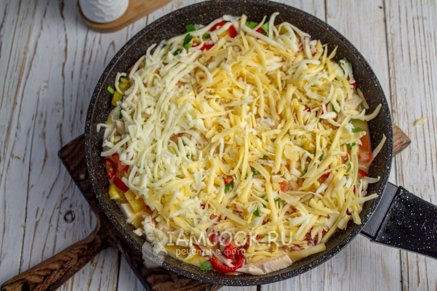 Поверх выложите натертый сыр. Убавьте нагрев до минимума и готовьте пиццу из лаваша с яйцом на сковороде под крышкой 10 минут, до готовности.