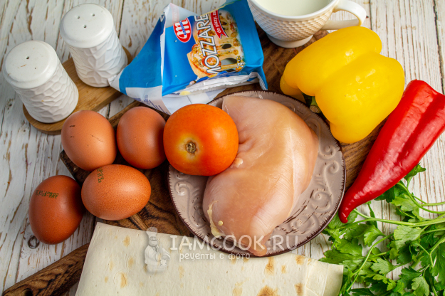Возьмите все необходимые ингредиенты для приготовления пиццы из лаваша с яйцом на сковороде.