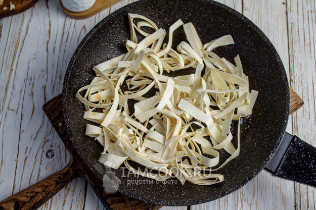 Лаваш сверните трубочкой и нарежьте на тонкие длинные полоски.