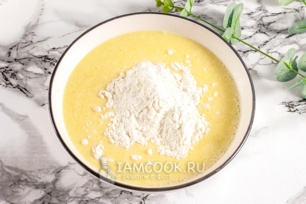 Аккуратно вмешайте в тесто пшеничную муку высшего сорта и потом влейте растительное масло. Оставьте блинное тесто на 10-15 минут для активации клейковины - блинчики не будут рваться при переворачивании.