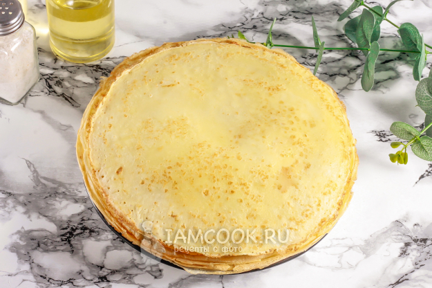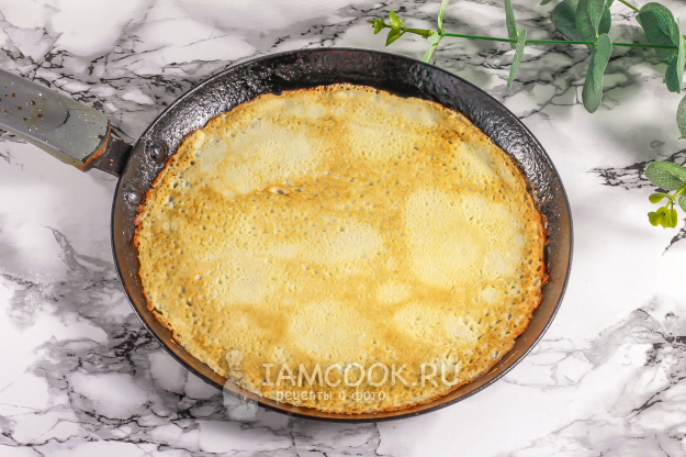 Затем прогрейте блинную сковороду, смажьте ее в первый раз растительным маслом. Влейте порцию теста и испеките блин до румяности примерно по 1-2 минуты с каждой стороны.