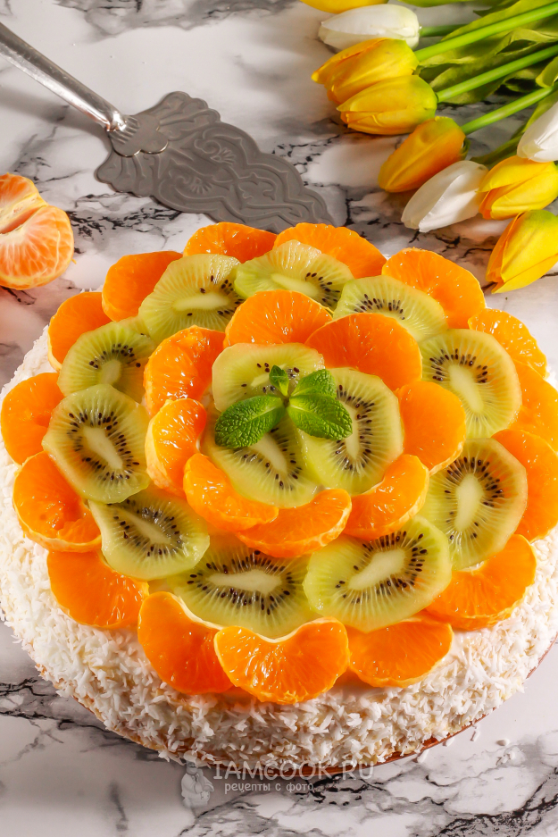 Блинный торт с кремом (из блинов на кефире) готов. При подаче украсьте фруктами или ягодами, шоколадом или кокосовой стружкой.
