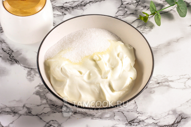 Перемешайте сметану любой жирности в глубокой миске с сахарным песком. Можно добавить загуститель для сметаны или для сливок - крем станет гуще.