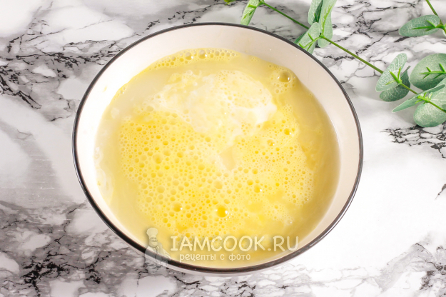 Куриные яйца взбейте с сахаром и солью, влейте кефир любой жирности и холодную воду. Воду добавлять обязательно, иначе блины на кефире получатся плотными. Взбейте еще раз.