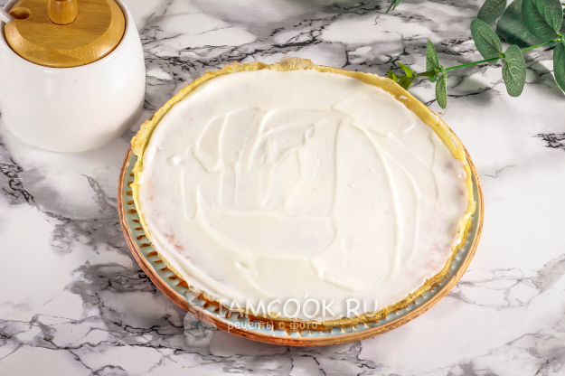 На тарелку выложите два блина и смажьте верхний сметанным кремом. Далее выкладывайте по одному блину и смазывайте его.