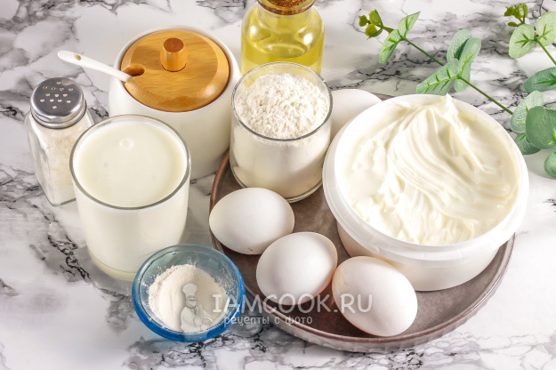 Подготовьте необходимые ингредиенты для создания вкуснейшего торта из блинов на кефире.