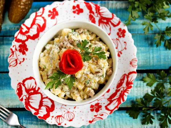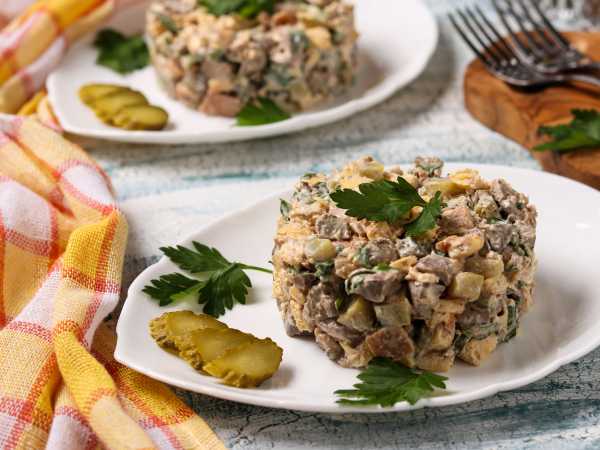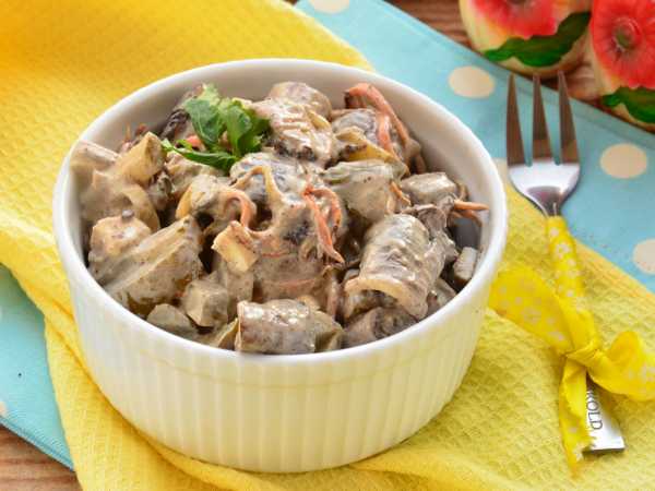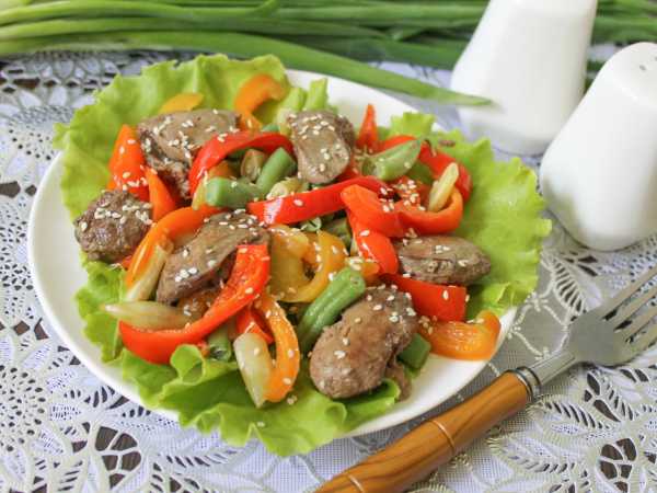 Промойте зеленый лук и измельчите. Присыпьте им салат и украсьте листочками петрушки или укропа. Если печенку не обжаривали, то слегка сбрызните салат растительным маслом и подайте к столу.